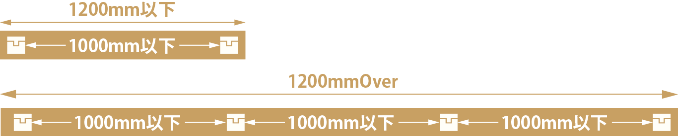 取付パーツが1セットの場合は、1200mm以下の1×4材をご使用いただけます。1200mmより長く設定したい場合は、1200mm以下で分割するか、2セット以上でご使用いただき、取り付けパーツの間隔が1000mm以下になるように設置してください。