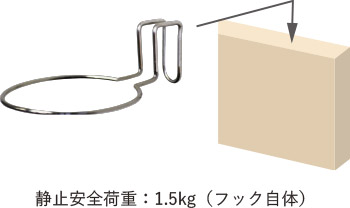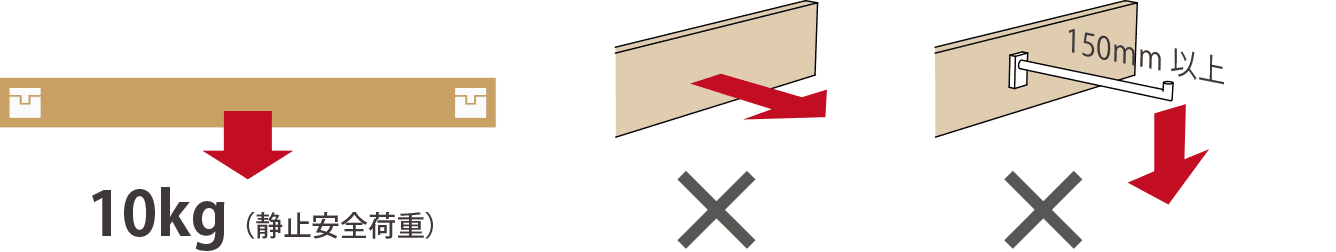 静止安全荷重の表記は、1×4材に真下方向へ負荷をかけた場合の数値です。水平方向への負荷がかかる使い方、また150mm以上壁から離れた箇所で下方向へ負荷がかかる使い方は絶対にしないで下さい。