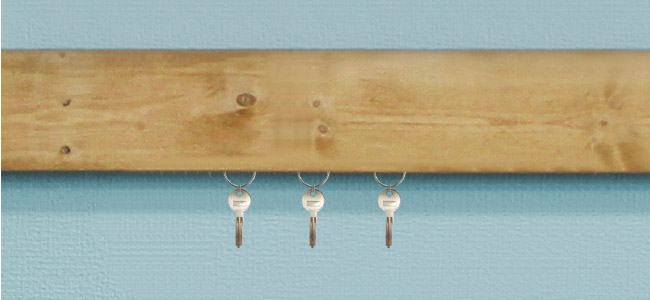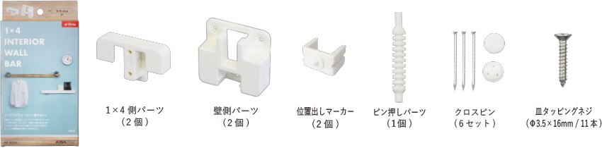 市販の1×4材を使ってインテリアに映えるウォールバーができます。石こうボード壁には跡の目立たないクロスピンで取り付け、木壁にネジ止めも可能です。オシャレに壁面収納を増やしてみませんか。