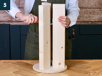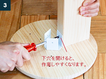 〔脚用ビス〕で〔脚固定パーツ〕を、〔座面〕中心の印に合わせてネジ止めします。