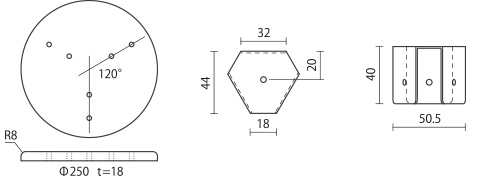 材質: 座面(パイン集成材 t=18 Φ250mm)座面用ビス(皿タッピングネジ、鉄、Φ4x50mm)脚固定パーツ(鉄、白塗装仕上) 脚用ビス(トラスタッピングネジ、鉄、Φ4x16mm)