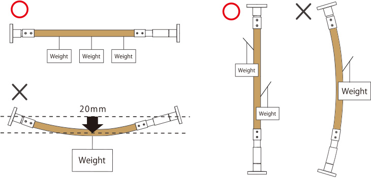 ・パッケージ裏面に表記してある耐荷重を守ってご使用ください。また、耐荷重表記の範囲内であっても荷重をかけた時に20mmを超えて丸棒が変形した場合は荷重を分散させるか、荷重を減らすようにしてください。