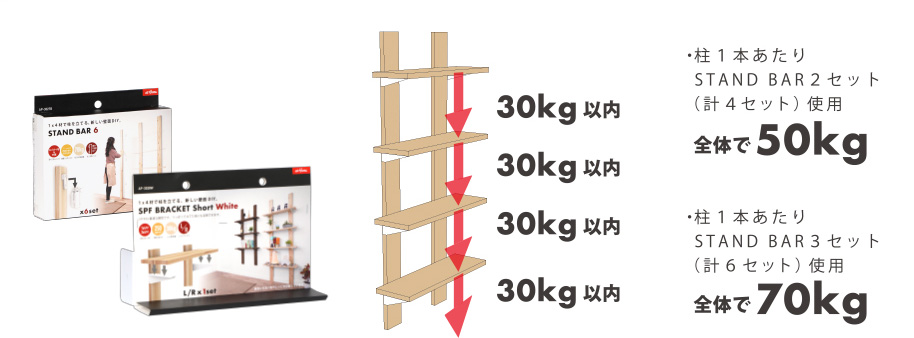 STAND BAR+SPF BRACKETで使用する場合は、それぞれの耐荷重に注意しましょう。