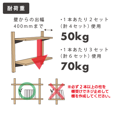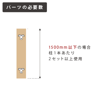 1本の柱のみで使用する場合、横方向のグラつきが出ることがあります。この場合、板幅の大きい柱を使用して図のようにパーツを取り付けるのが有効です。また、荷重が掛かる位置をパーツとパーツの中間に設定しましょう。