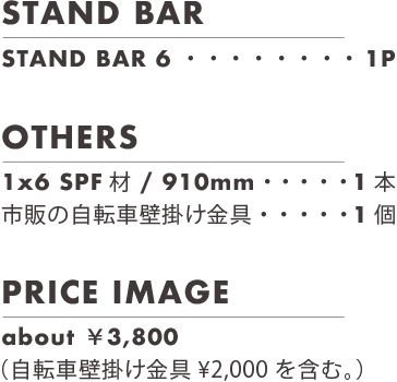 STAND BARで1x6材の柱を作って市販の自転車壁掛け金具と組み合わせれば、とてもスッキリとしたバイクスタンドを作ることができます。