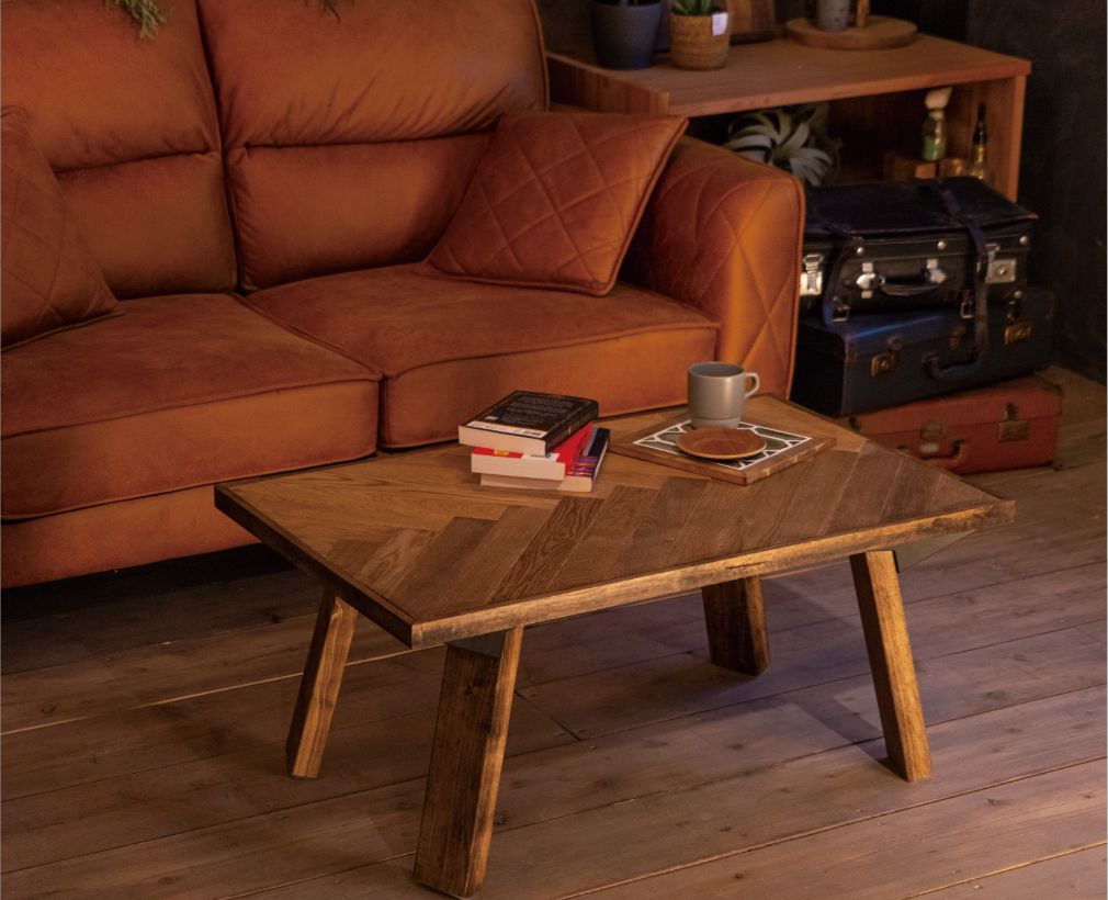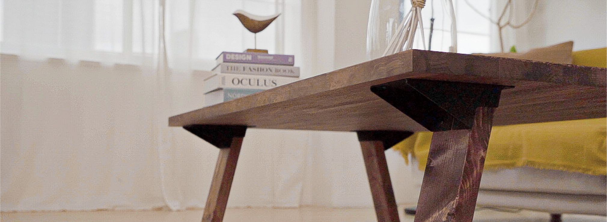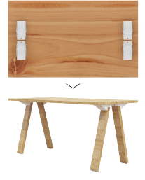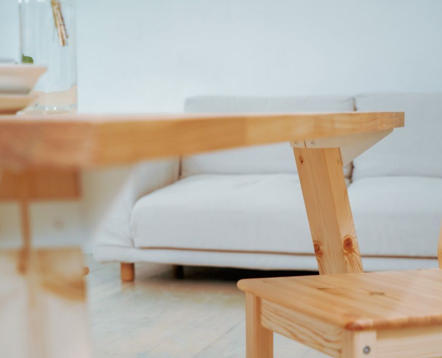天板の形に4辺を切り落としたら、断面を目隠しして天板の完成です!時間が経つと木が反ってくるので、ボンドと一緒に、隠し釘やピンネイラーで止めておくのがオススメです。最後にナナレグで脚を取り付けてローテーブルの完成です。