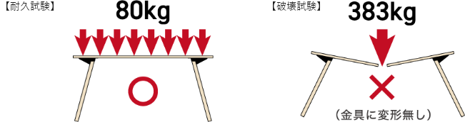 耐荷重は天板の厚みや材質、足の配置によって変化するため保証値ではありません。自分の設計したテーブルと比べながら、参考値としてお考えください。
