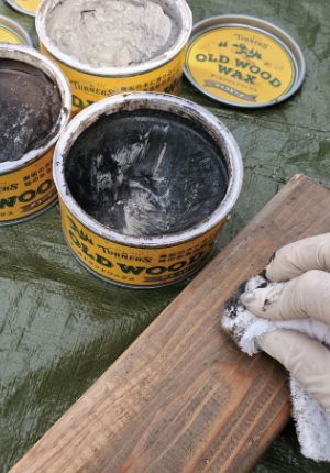 古材の足場板と新品の2×4材は、そのまま組み合わせると天板とテーブル脚のテイストがチグハグになってしまいます。OLD WOOD WAXなどを活用しながら、まとまりのある質感に仕上げていきます。複数の色を混ぜながら塗り込んで、色ムラを作るのもおすすめです。