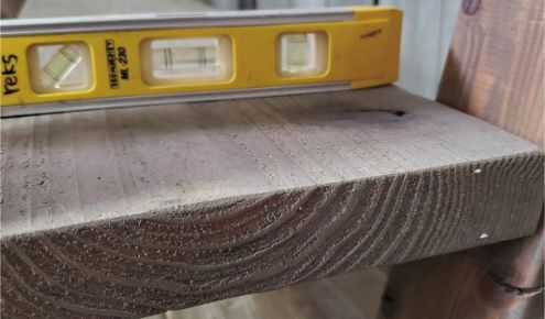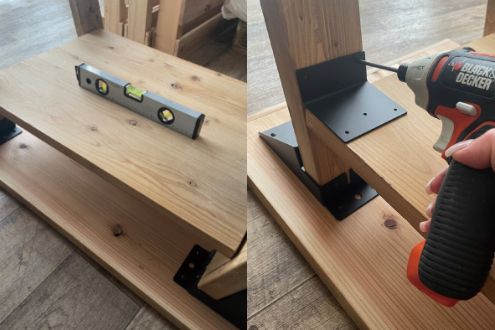 脚の間に棚板を仮置きします。水準器などで水平が確認できたらナナウケを使って棚板と脚を固定しましょう。