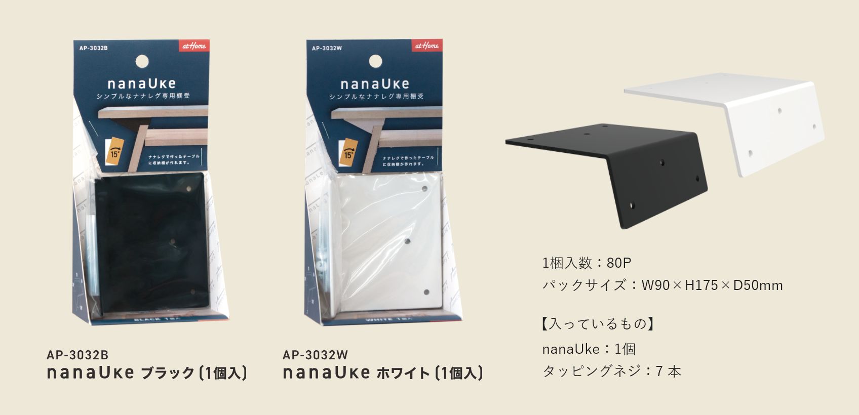 nanaUke[ナナウケ]は、ナナレグで作ったデスクやテーブルにぴったりの15°の角度がついた棚受けです。天板の下にちょっとした収納スペースを作ることで天板の上はいつもすっきりと整理した状態で使用することができます。棚受けは最大限シンプルな形状にデザインされています。