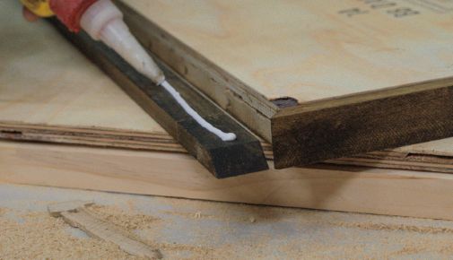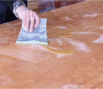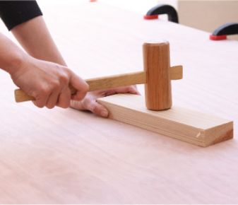 2枚のラワンランバーコアに接着剤を塗り広げて重ね、分厚い1枚の天板にします。天板に傷をつけないように当て木をしながら、木槌などで叩いてしっかりと接着していきます。この作例では木目が露出する面積が少ないので、こうして比較的安価な材料を活用することでコストを抑えることができます。