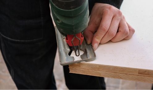 ジグソーなどで天板の角を落とし丸く仕上げます。一度で綺麗に切り落とすのは難しいので、少し大きめにカットしてから、サンディングで整えていきます。