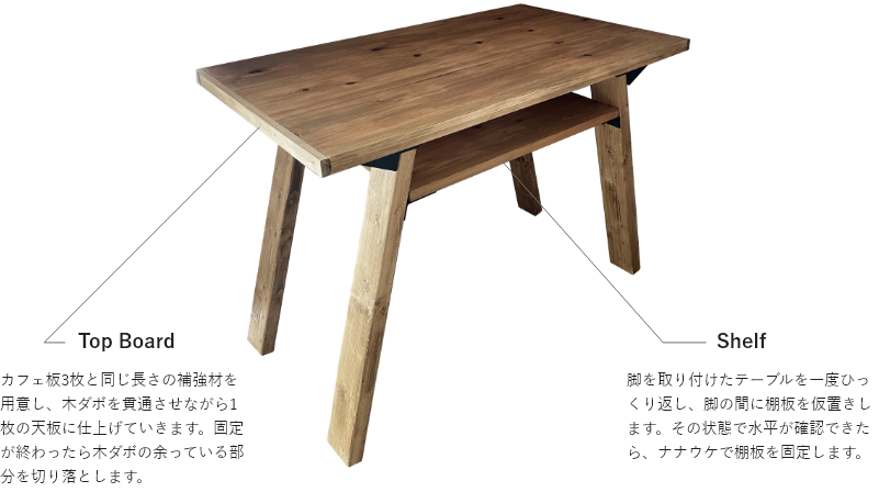 テーブルの奥行と同じ程度の長さの金具を用意し、2枚の足場板から1枚の天板を作って、ナナレグで脚を取り付けていきます。