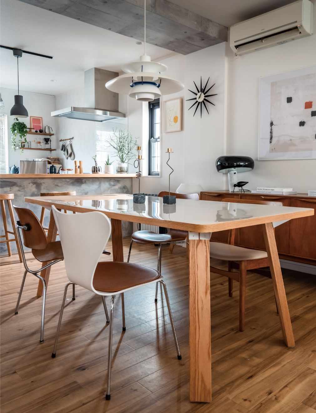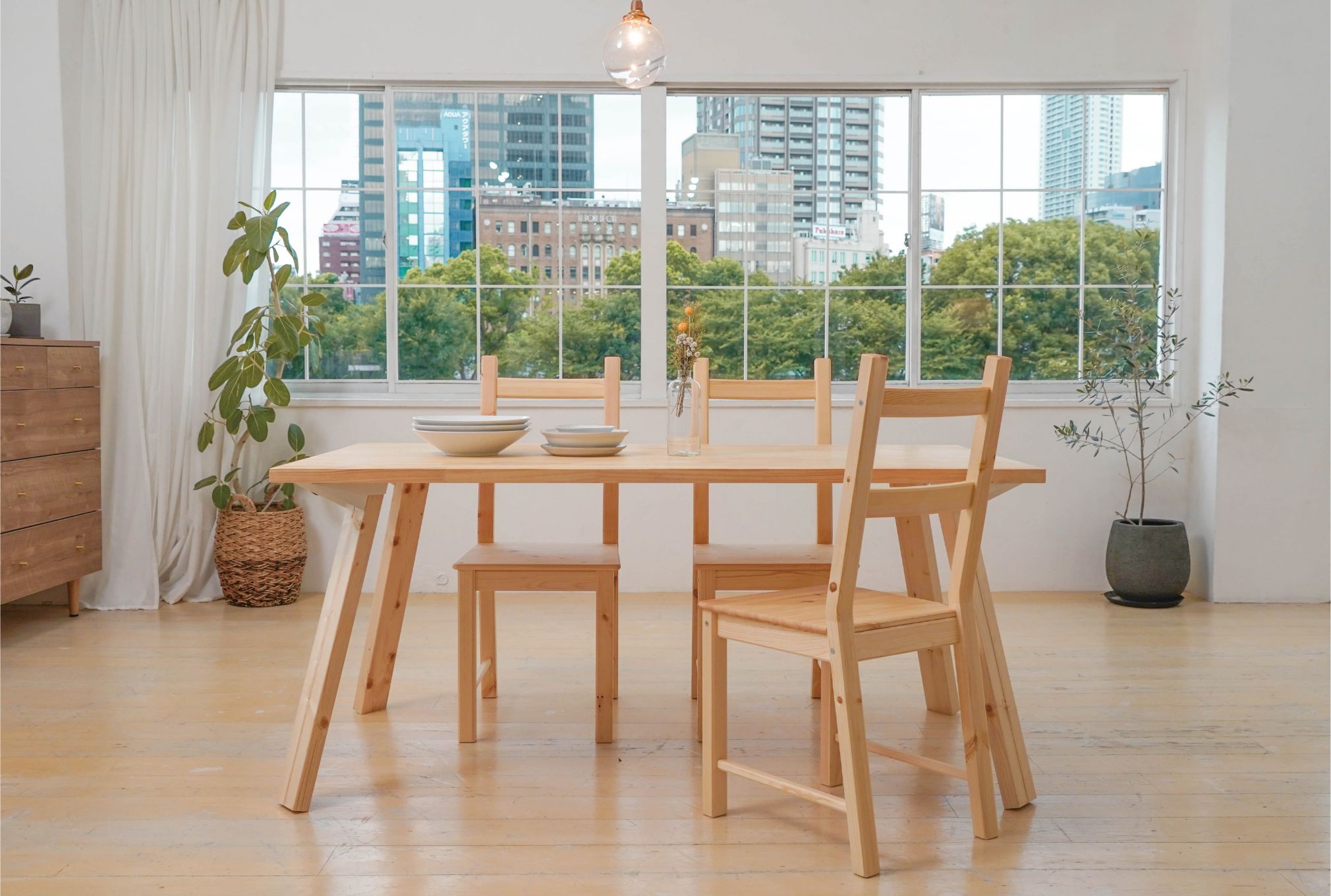 メラミン化粧板の天板なら、こぼれた水や食べ物もサッと拭き取ることができます。汚れに強く、清潔感のある天板はダイニングテーブルに最適です。