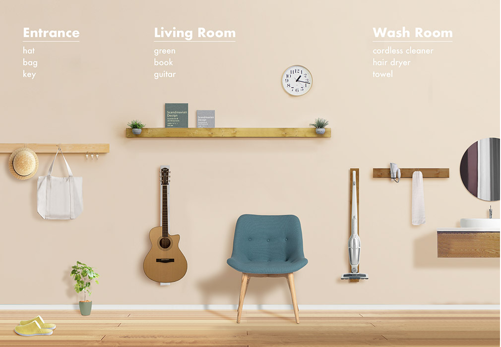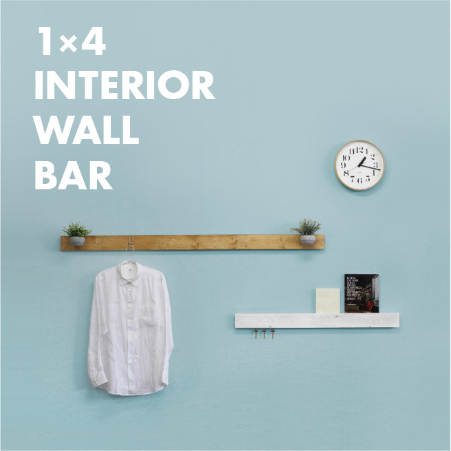 市販の1×4材を使ってインテリアに映えるウォールバーができます。石こうボード壁には跡の目立たないクロスピンで取り付け、木壁にネジ止めも可能です。オシャレに壁面収納を増やしてみませんか。