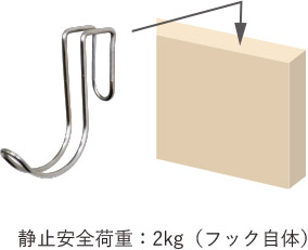 静止安全荷重の表記は、1×4材に真下方向へ負荷をかけた場合の数値です。水平方向への負荷がかかる使い方、また150mm以上壁から離れた箇所で下方向へ負荷がかかる使い方は絶対にしないで下さい。