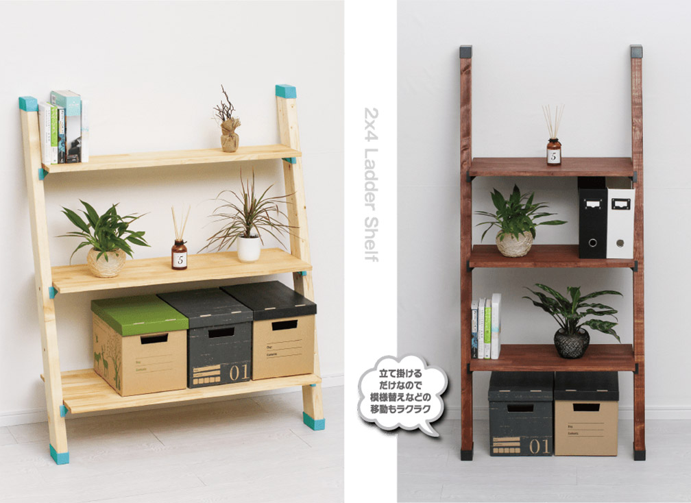 2×4材と棚板だけでオシャレな立て掛けタイプのシェルフがDIYできます。