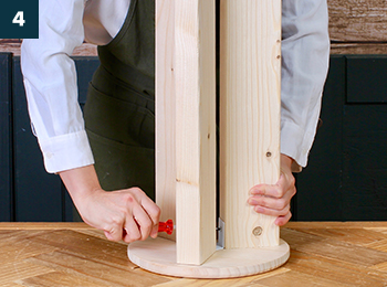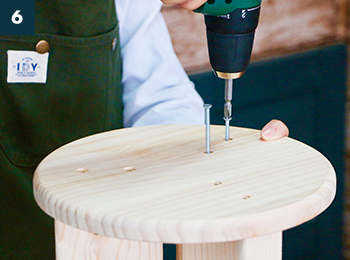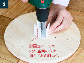 〔脚用ビス〕で〔脚固定パーツ〕を、〔座面〕中心の印に合わせてネジ止めします。