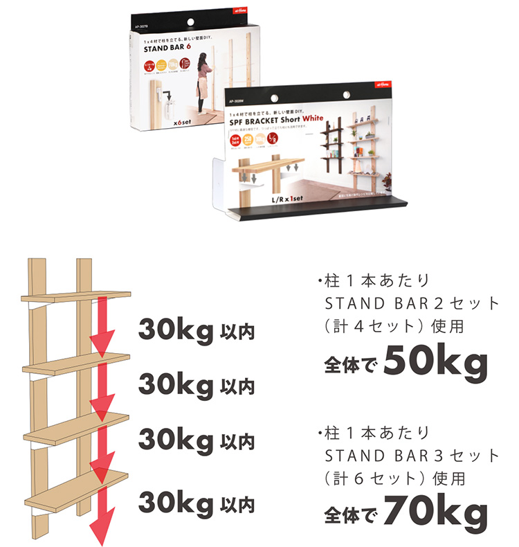 STAND BAR+SPF BRACKETで使用する場合は、それぞれの耐荷重に注意しましょう。