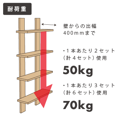 1本の柱のみで使用する場合、横方向のグラつきが出ることがあります。この場合、板幅の大きい柱を使用して図のようにパーツを取り付けるのが有効です。また、荷重が掛かる位置をパーツとパーツの中間に設定しましょう。