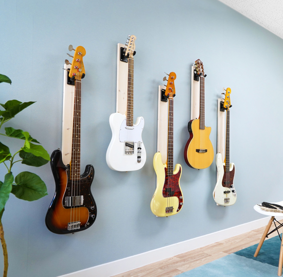 ギターやベースを楽器ショップのようにディスプレイすると、カッコいいだけでなくネックにも安心です。でも壁に吊るのが理想とは分かっていても、つっぱりDIYだと地震の時に倒れないかな…といった不安もあります。
