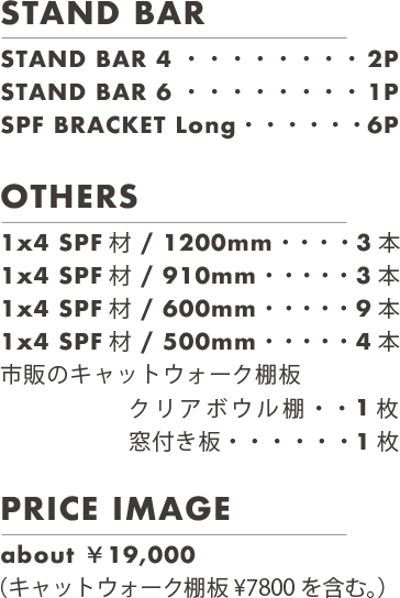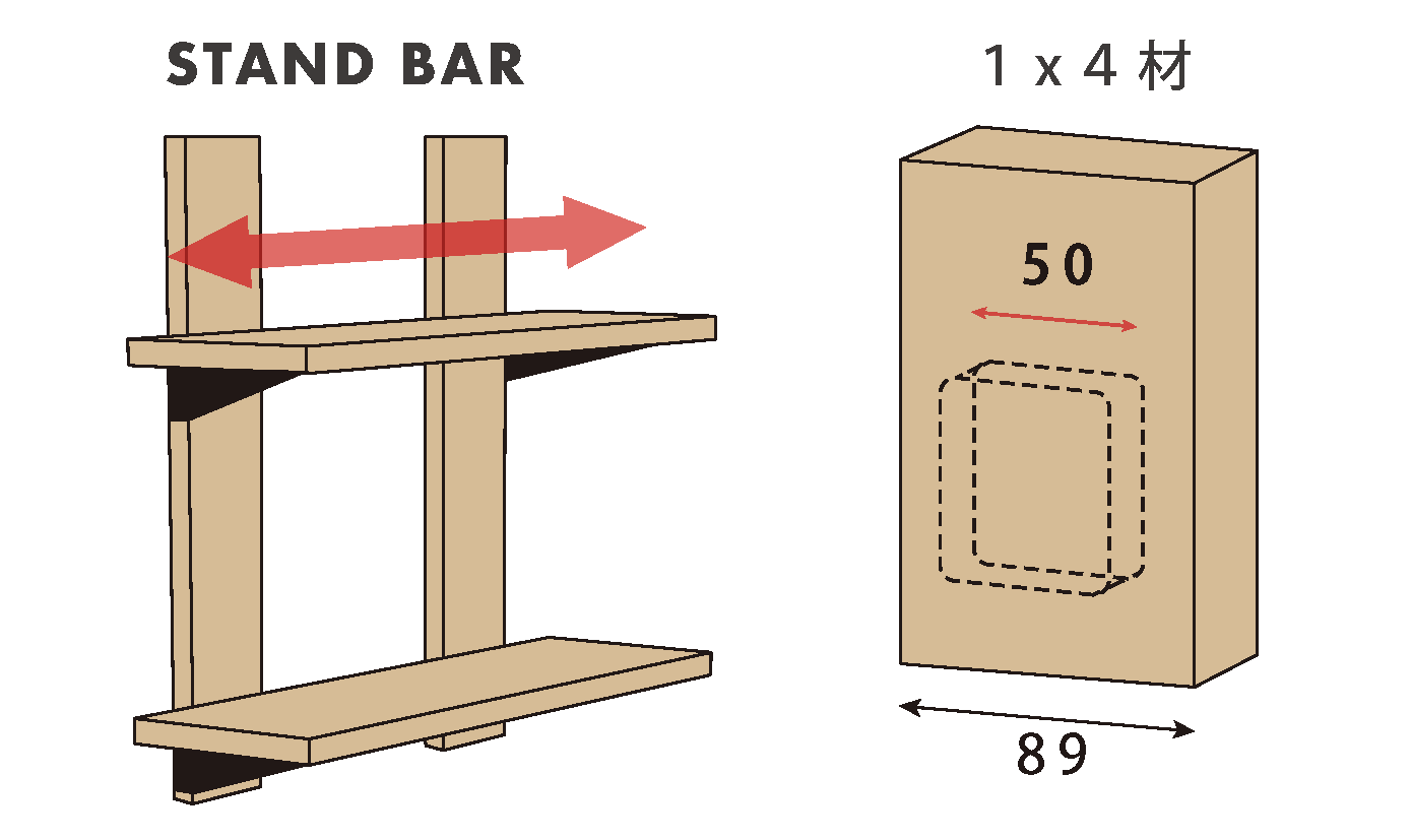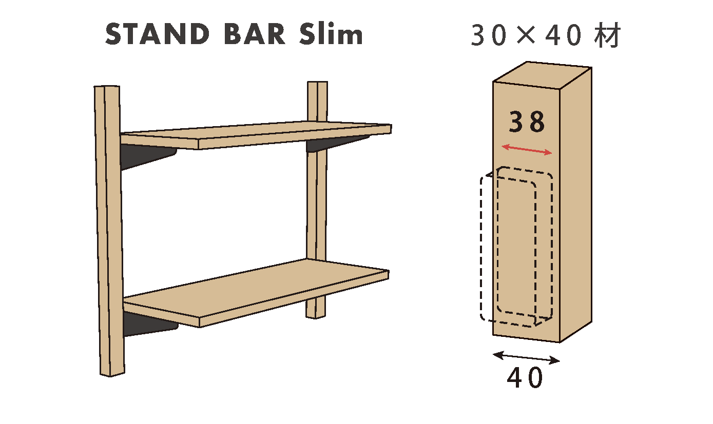 STAND BAR Slimは30×40mm材や2×2材などの一般的な木材を使って細い柱でスタイリッシュな収納がDIY出来ます。自分ならではのスリムな収納棚をDIYしてみませんか。