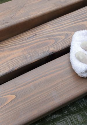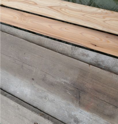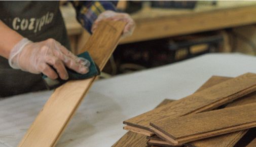 古材の足場板と新品の2×4材は、そのまま組み合わせると天板とテーブル脚のテイストがチグハグになってしまいます。OLD WOOD WAXなどを活用しながら、まとまりのある質感に仕上げていきます。複数の色を混ぜながら塗り込んで、色ムラを作るのもおすすめです。
