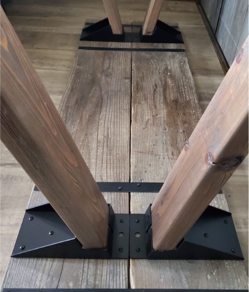 テーブルの奥行と同じ程度の長さの金具を用意し、2枚の足場板から1枚の天板を作って、ナナレグで脚を取り付けていきます。