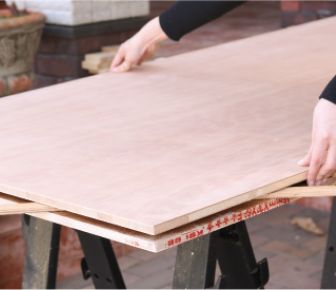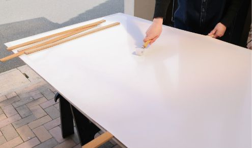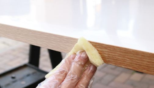 天板よりも少し大きめにカットしたメラミン化粧板を接着剤で貼り付けます。中心から外側に向かって空気が入らないように注意しながら貼り付けます。