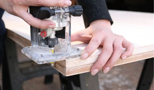 天板からはみ出た部分をトリマーで削り、側面を平らに整えます。