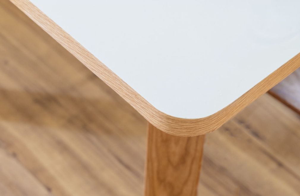 木口テープとテーブル脚をオイルで仕上げていきます。クリアのオイルを塗布することで木目を美しく見せることができます。ナナレグで脚を取り付けてテーブルの完成です。