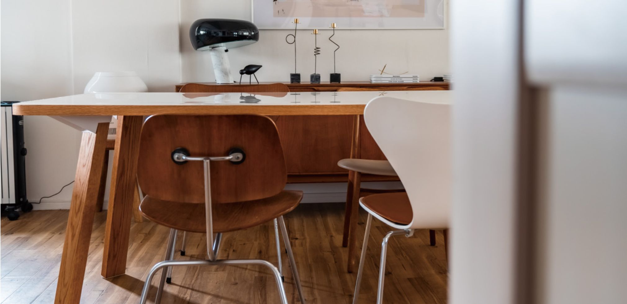 メラミン化粧板の天板なら、こぼれた水や食べ物もサッと拭き取ることができます。汚れに強く、清潔感のある天板はダイニングテーブルに最適です。