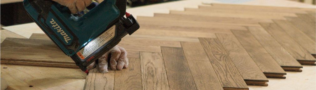 ヘリンボーンで難しいのは、隙間なく板を敷き詰めること。今回は初心者でも取り組みやすいように床材を使った作り方を紹介してくれました。サネ(溝)を噛み合わせればズレることがないので作業がしやすくなります。
