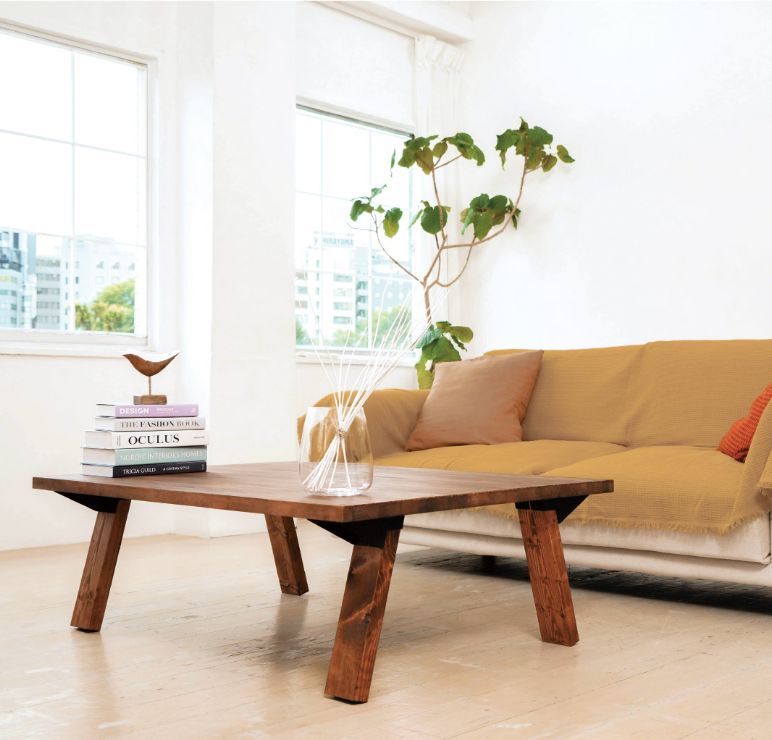 天板の形に4辺を切り落としたら、断面を目隠しして天板の完成です!時間が経つと木が反ってくるので、ボンドと一緒に、隠し釘やピンネイラーで止めておくのがオススメです。最後にナナレグで脚を取り付けてローテーブルの完成です。